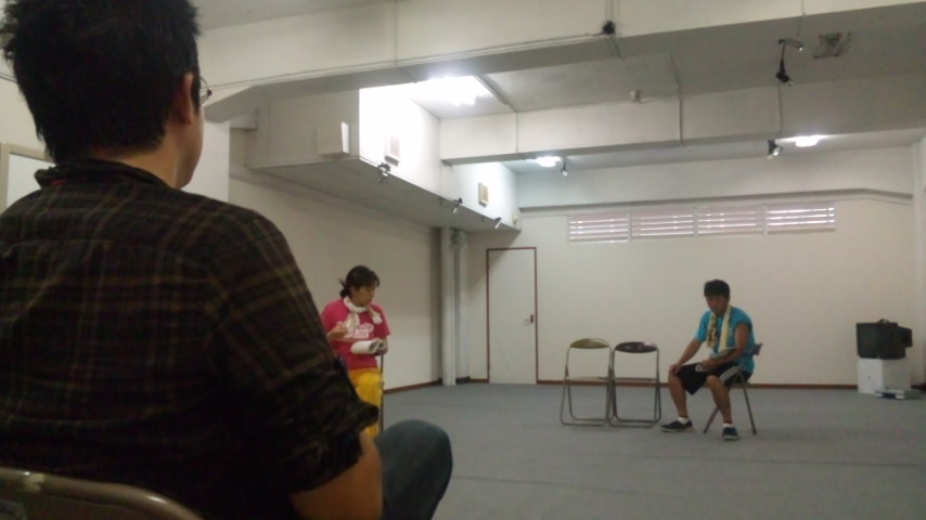 普段あまり演出エンドゥ氏の背後から稽古を見ることはないのですが、今日はうまいこと(?)背後にまわりこめたので、演出の背中越しから写真を撮ってみました。